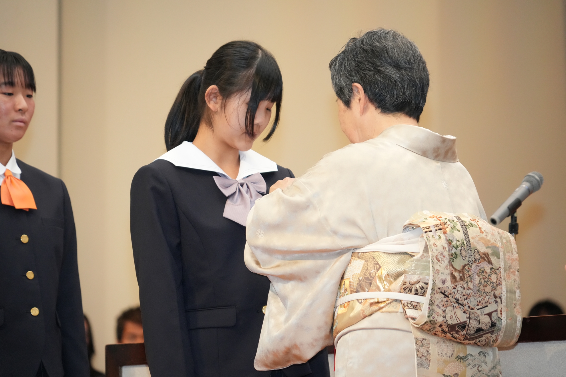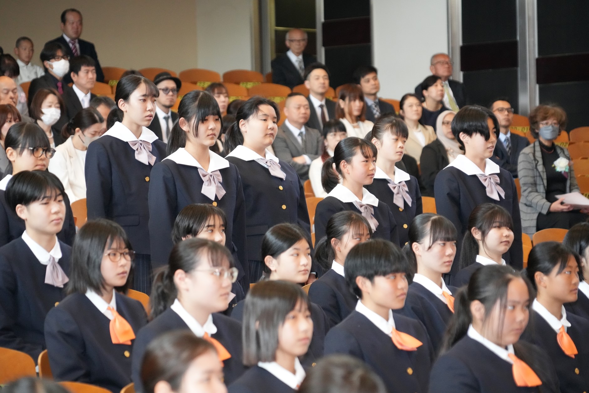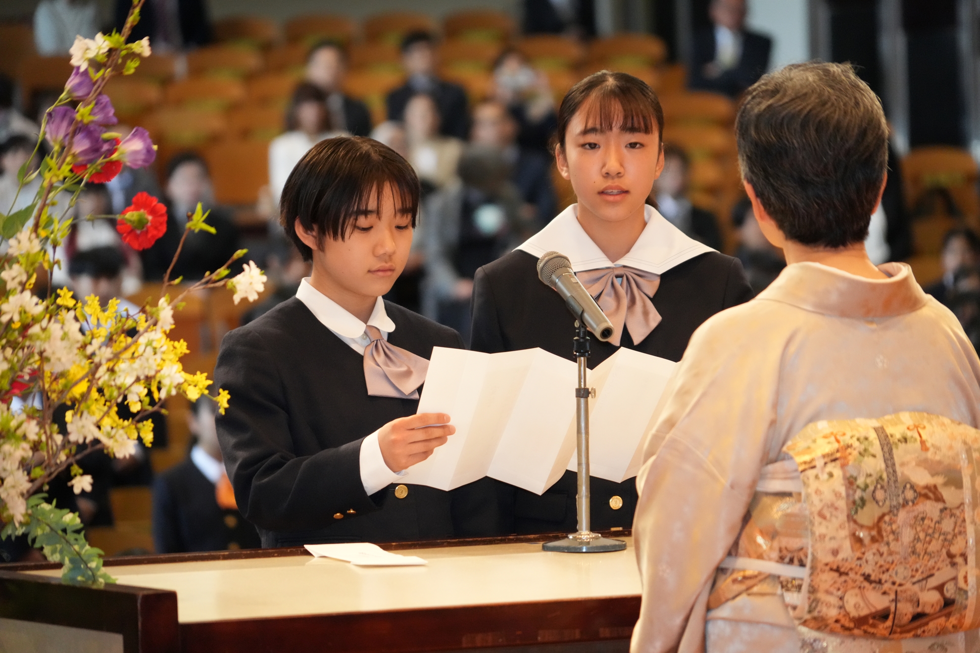 今年の入学式は、4月9日に高校と一緒に行われました。まず、中学新入生の名前が一人ひとり呼ばれ、みな、大きな声で返事をして、習いたての一礼がしっかりとできました。その後、援会長の北村正平藤枝市長をはじめとした方々からの祝辞がありました。さらに、校章授与、新入生宣誓、記念品授受などのセレモニーを、それぞれの代表者が高校生と並んで、立派におこないました。これからの23人の成長と活躍を楽しみにしています。